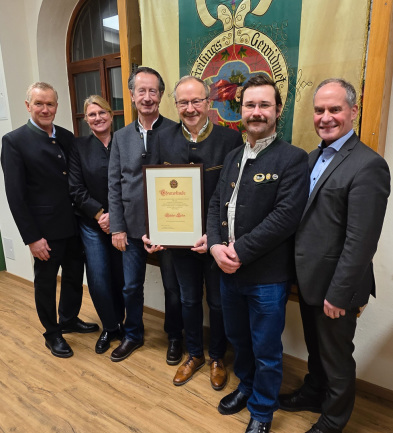 Im Foto von links nach rechts: Heinz Scheffzick, 1. Schützenmeister, Claudia Scheffzick, 2. Schriftführerin, Thomas Wowsnik, 2. Schützenmeister, Günter Soller, Ehrenmitglied, Maximilian Pollinger, 1. Sportleiter und Christian Sperrer, 1. Schatzmeister